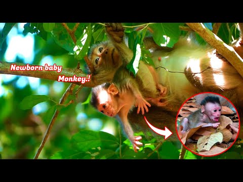 Oh God…! What a heart-wrenching sight—this tiny newborn baby monkey, no bigger than a human hand, sits trembling on a tree branch. Its eyes, wide and full of confusion, scan the forest desperately. Its soft cries echo through the canopy like whispers of sorrow, calling for the warmth and comfort only a mother can give.