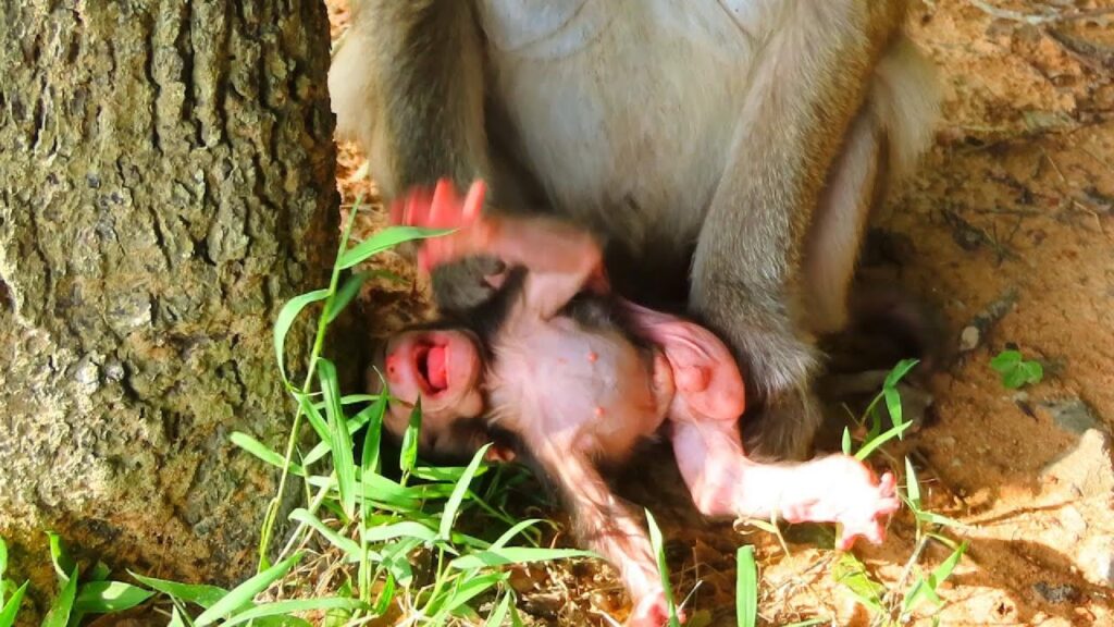 A tiny baby monkey, no more than a few days old, trembles alone on a patch of sunlit earth. His small frame quivers from hunger and confusion, his soft cries barely louder than the whisper of the wind. Once again, he had reached out to nurse—to find comfort, warmth, and life from his mother—but she turned away, just far enough to keep him from latching on.